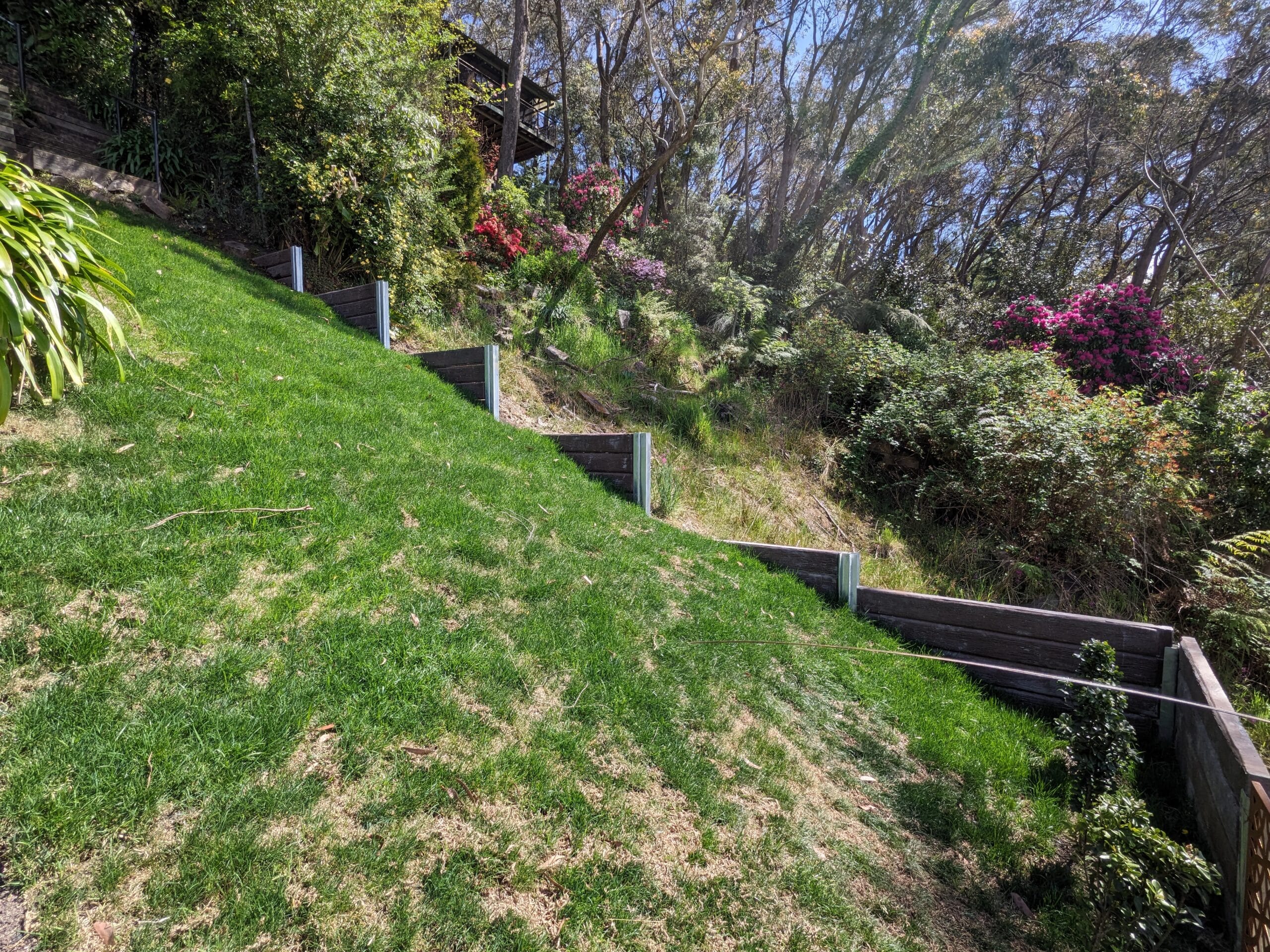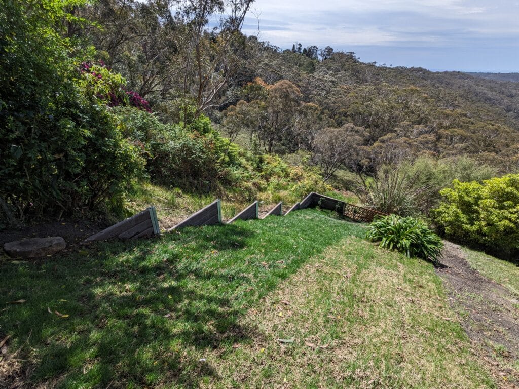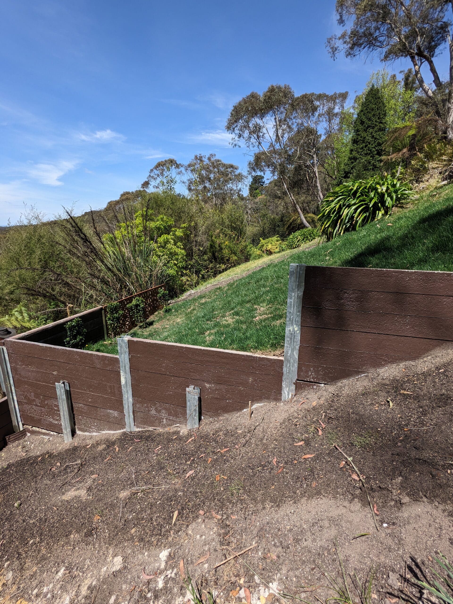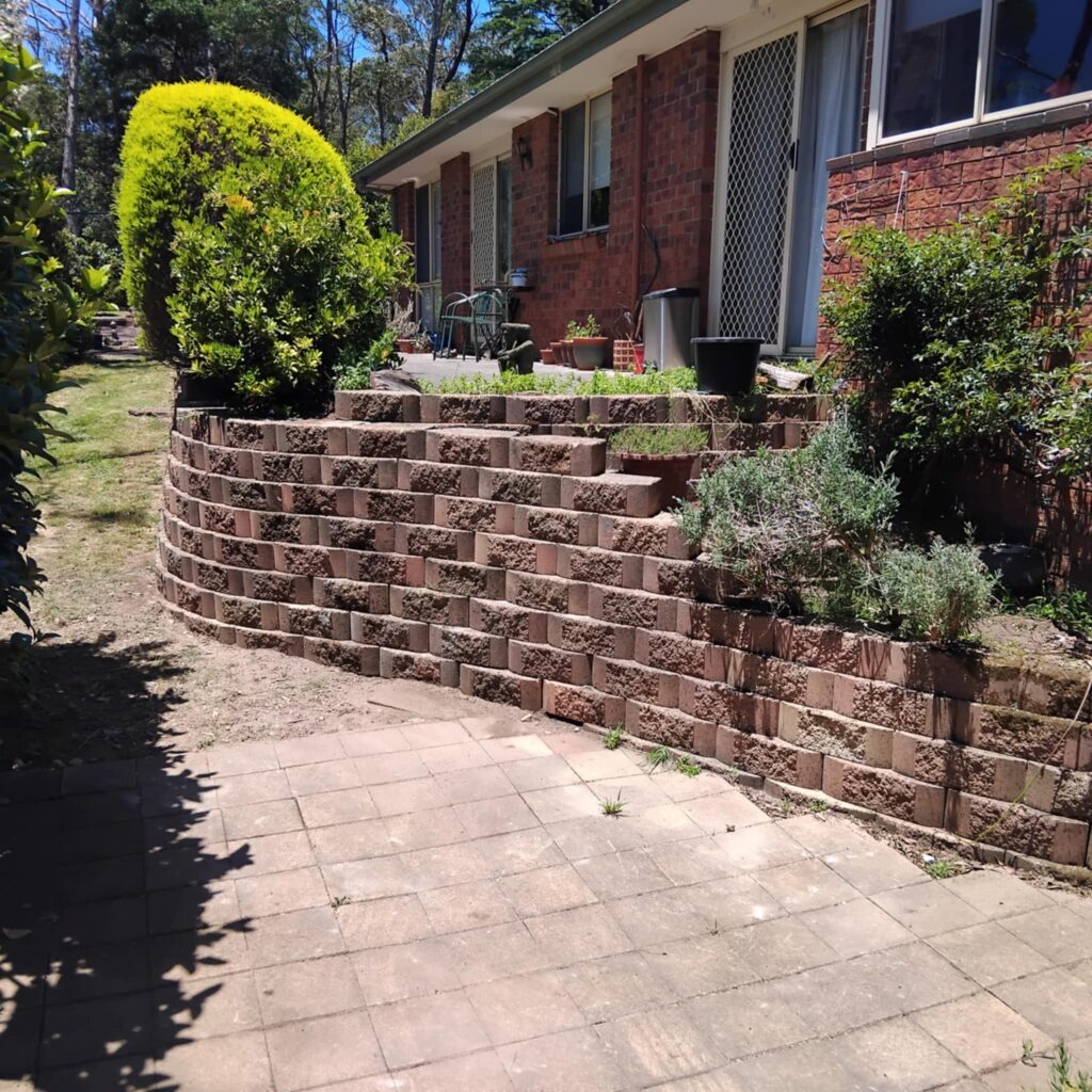 - Slope Stabilisation Retaining walls hold back soil on sloped properties, preventing erosion and landslides. Essential for Blue Mountains terrain where slopes are common and soil movement can threaten structures and safety.